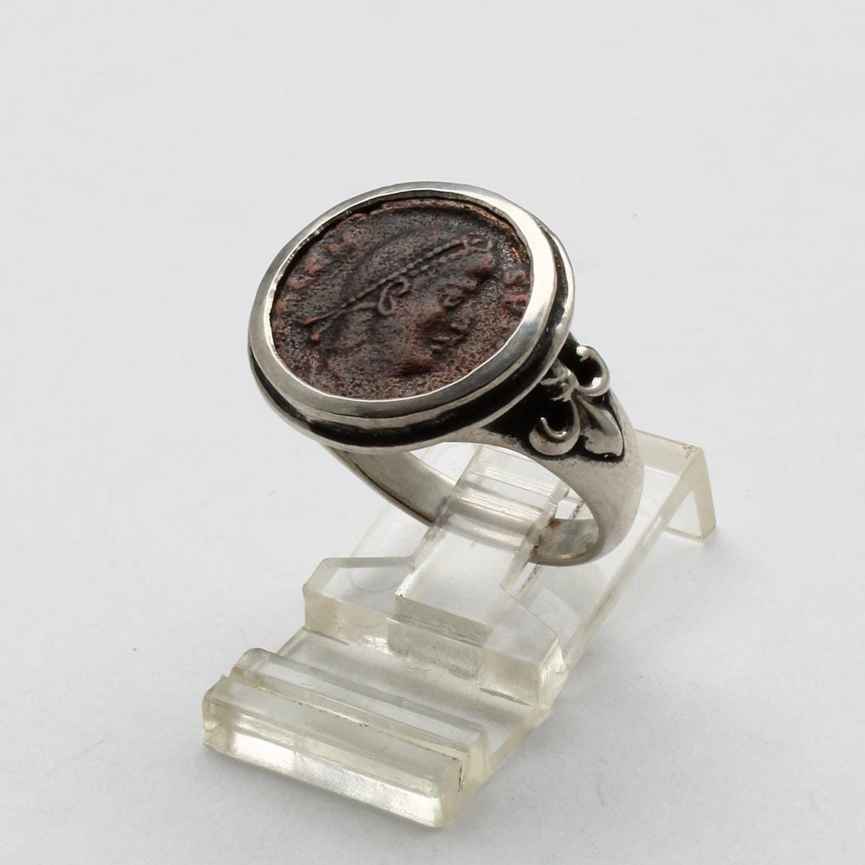 Description: This Sterling silver ring is set with an authentic ancient Roman Bronze coin date from 2nd to 4th Cent AD. The front of the coin is a head of then current roman emperor. The Roman Mint was established as the Temple and Factory of a Roman God named Juno Moneta. The word “money” is derived from this god’s name. These mints relied on vast numbers of manual laborers. Since each coin had to be struck by hand, no two are identical.