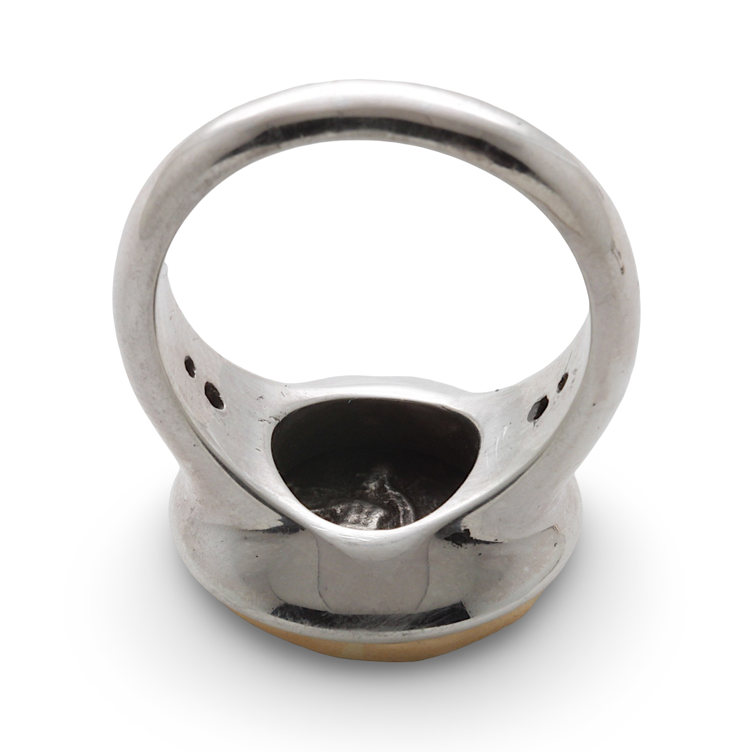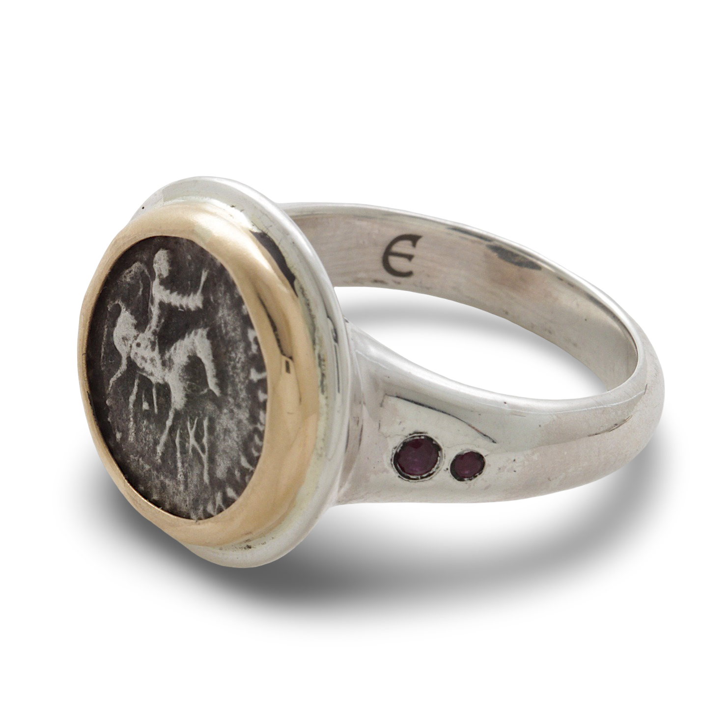 Indo-Scythian Drachma Coin, Silver Ring, 18K Gold Bezel, Ruby Accents, 8042