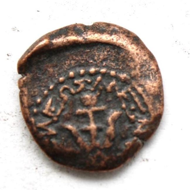 This coin is also known as the Widows Mite and mentioned in the New Testament. These coins are dated from 1st century BC. Alexander Janneus, nephew of Simon and Judah Maccabee, minted this bronze Prutah. He became ruler of the Jews in 103 BCE and was young and ambitious ruler.