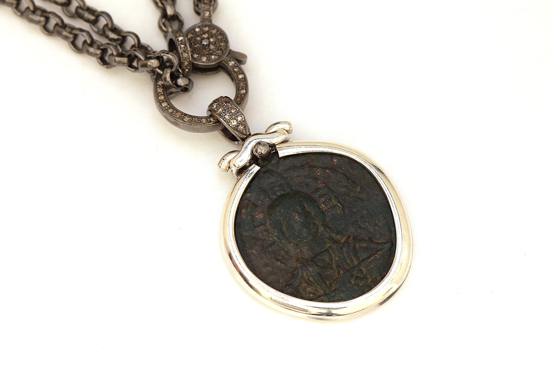 This sterling silver pendant is set with a Genuine Ancient Byzantine Coin. The Chain: The sterling silver chain is 36" and is detachable from the piece. It has a diamond pave bail loop and could be worn 3 different ways. Full length, doubled trough the loop and doubled not through the loop. Very versatile chain.